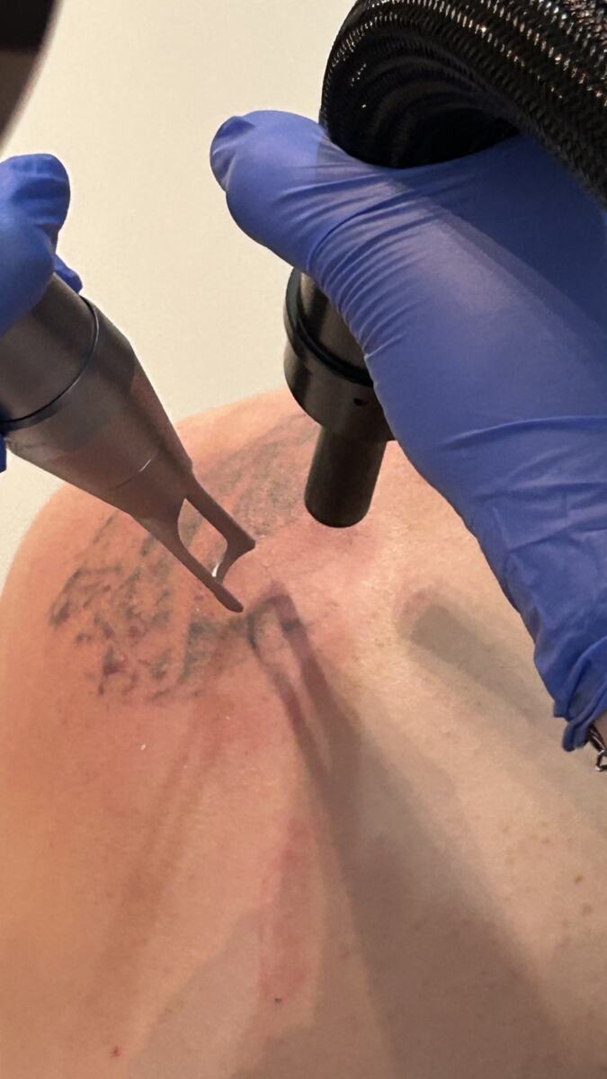 There are two machines used in the removal process. First, a cooling machine is used which helps numb the skin, then, a Q-Switch Laser targets the ink in the skin and breaks up the pigment into minuscule particles. The clients lymphatic system then targets the rest. As the skin heals, the tattoo’s appearance fades.