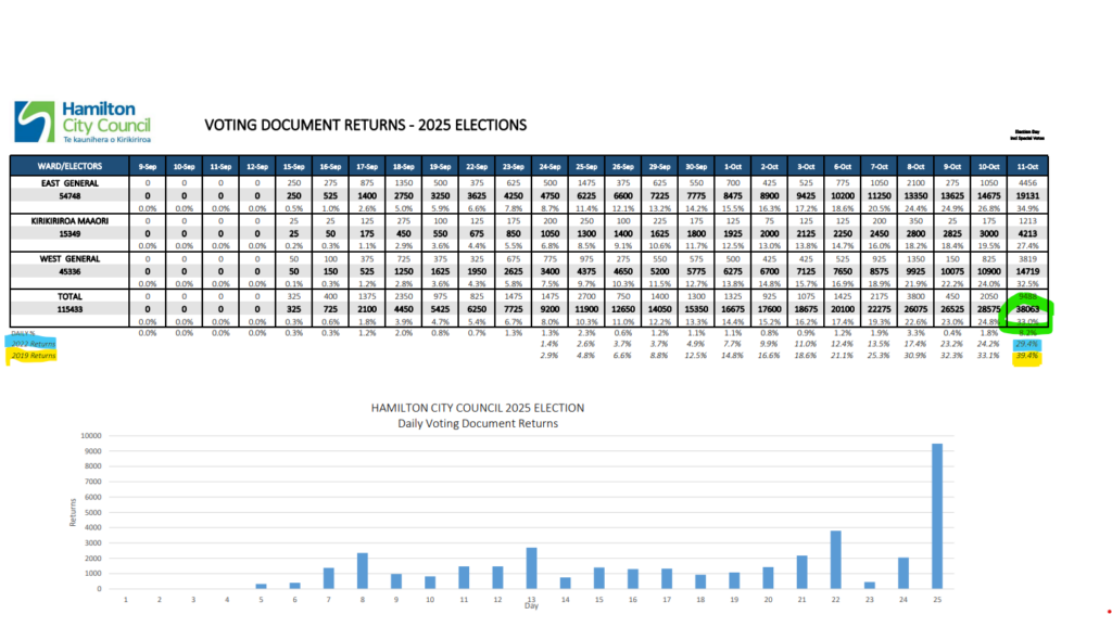A last minute rush and a range of initiatives from tiktoks to pop up events couldn’t get 2025 local body voters up to the high of 2019, but Hamilton City Council said every percentage increase counts.