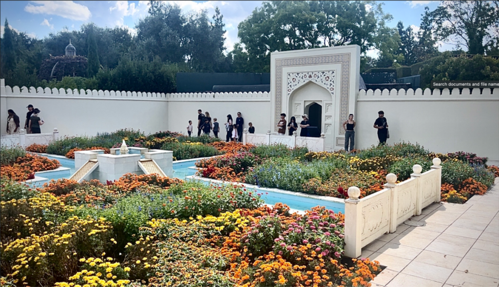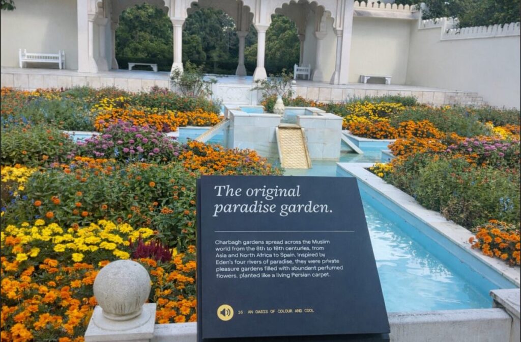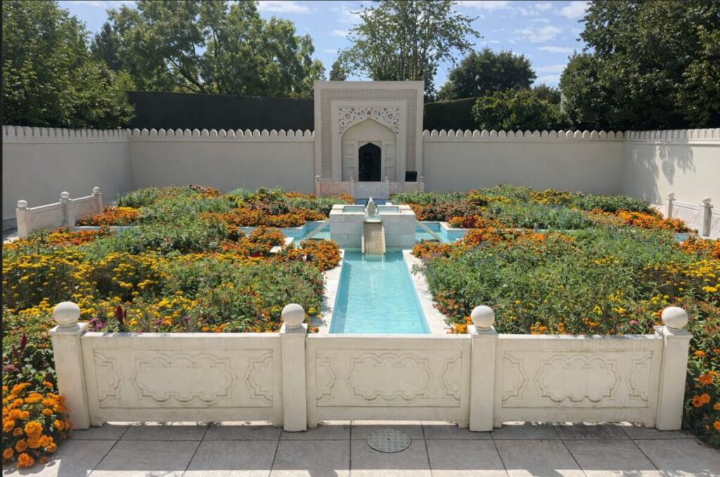 One of the most popular spaces is the Indian Char Bagh, influenced by Persian and Mughal traditions. The design reflects Jannah, paradise, reflecting Islamic ideas of the divine order. The walled garden is split into four parts by streams of water. These streams stand for the rivers of paradise and represent purity (Tahara), peace (Sakina) and divine blessing (Barakah).